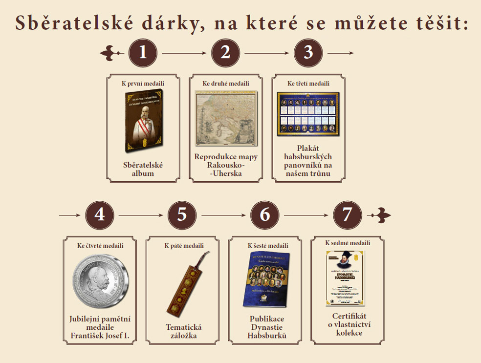 Kolekce Dynastie Habsburků je k dostání výhradně u Národní Pokladnice a každou medaili z kolekce získáte za pouhých 1199 Kč (+ 129 Kč poštovné a balné).
